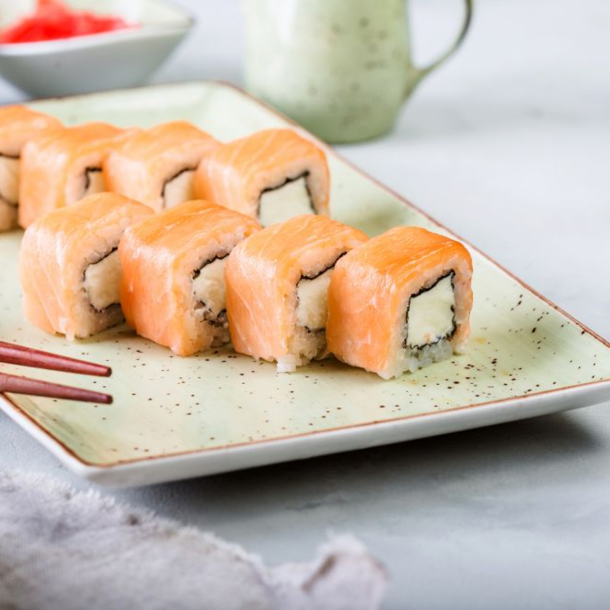 Рис , нори, сыр сливочный, огурец, лосось, соус Унаги, кунжут