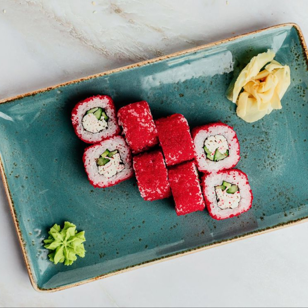 Рис, нори, сыр сливочный, авокадо, краб снежный, огурец, икра масаго, микро зелень